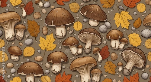 © edo, Fototapeta premium Autumnal Feast A Seamless Eco Motif of Mushrooms and Fallen Leaves, Perfect for Designs