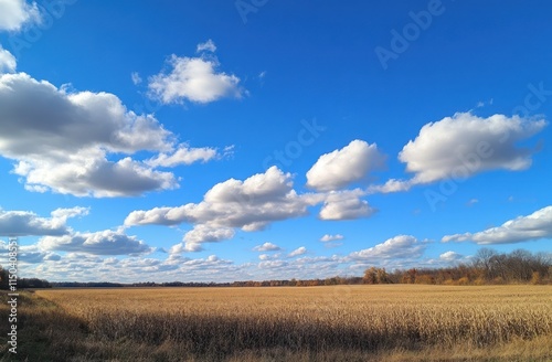 Fototapeta premium Autumnal Field Under a Blue Sky with Puffy Clouds