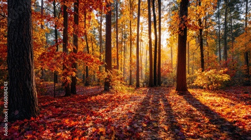 © Adnan, Obraz premium Autumnal forest bathed in golden sunlight