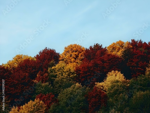 Fototapeta premium Autumnal forest canopy against a clear blue sky. Vibrant red, orange, and...