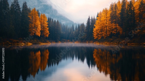 © Toqeer, Obraz premium Autumnal Forest Landscape Reflected in Calm Lake Water, Misty Mountain Backdrop