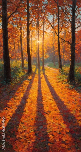 © JOYKO, Fototapeta premium Autumnal forest path at sunrise. Long shadows stretch across a carpet of vibrant fall foliage, leading into a sun-drenched woodland