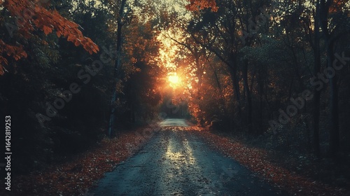 © Isnaini, Fototapeta premium Autumnal forest path at sunset