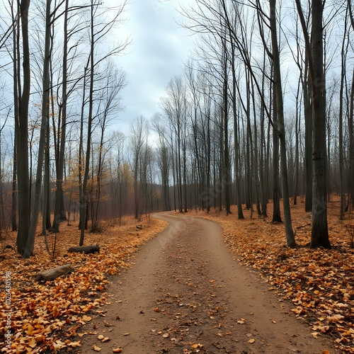 Naklejka premium Autumnal Forest Path, Bare Trees, Grey Sky, Fallen Leaves