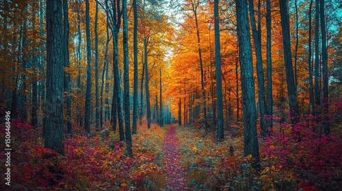 © rafani, Fototapeta premium Autumnal forest path bathed in vibrant hues.