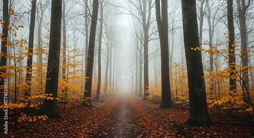 Obraz premium Autumnal forest path leading into the misty distance scenic nature landscape