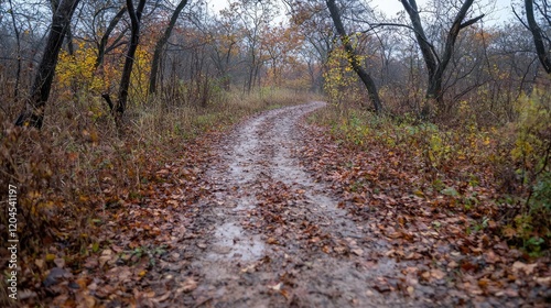 Fototapeta premium Autumnal forest path, leaves, wet, muddy, trees, walk