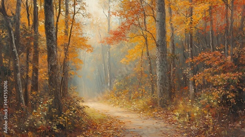 Fototapeta premium Autumnal Forest Path Sunlight Golden Hour Landscape Painting