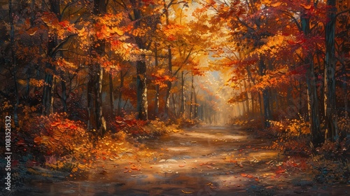 Obraz premium Autumnal forest path, vibrant fall foliage.