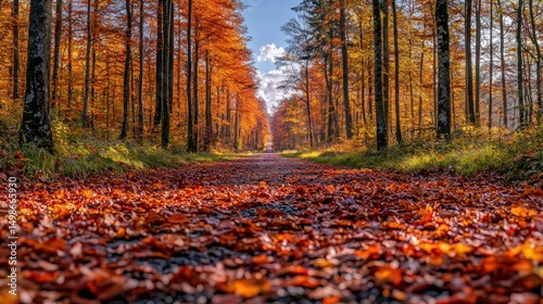 Fototapeta premium Autumnal forest path, vibrant fall foliage