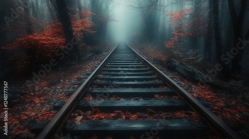 Naklejka premium Autumnal forest railway track disappearing in fog