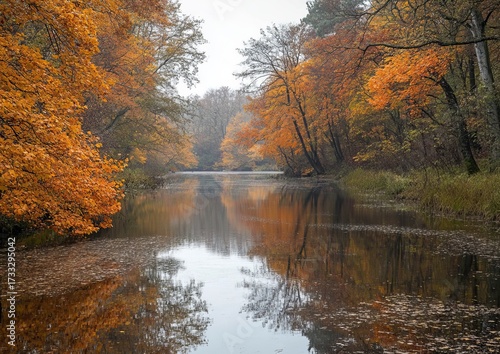 © Ninth, Fototapeta premium Autumnal forest reflects in a calm river