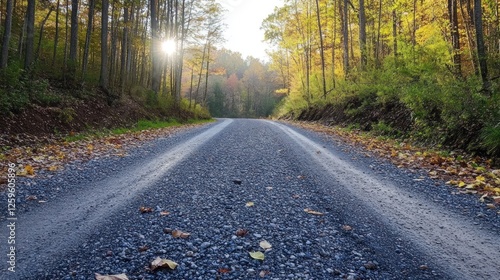 Fototapeta premium Autumnal forest road, sunlit path, fall foliage, scenic drive, nature background