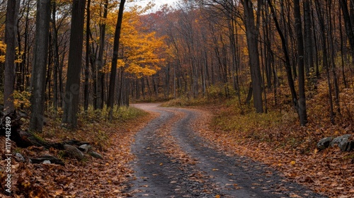 Obraz premium Autumnal Forest Road Winding Path, Golden Leaves, Dark Trees