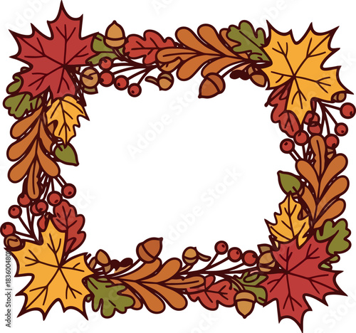 Fototapeta premium Autumnal Frame with Maple Leaves Berries and Acorns.