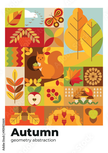 © Lina_vector, Obraz premium Autumnal geometric background with forest plants, fruits, leaves, squirrel and butterfly. Autumn abstract poster with forest nature elements. Flyer, invitation, banner.