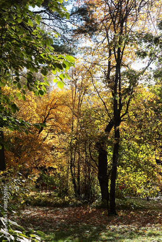 © Maria Brzostowska, Fototapeta premium autumnal golden foliage of trees in park