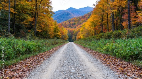 © MAKASIHMAS SIDNEY, Obraz premium Autumnal gravel road through colorful forest, mountains backdrop, scenic drive