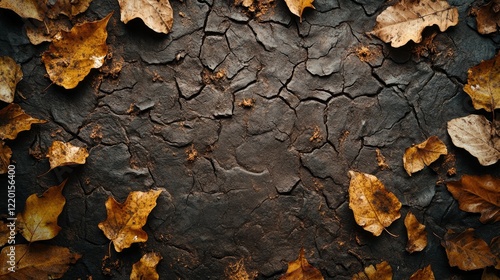 Obraz premium Autumnal Ground: Dry Cracked Earth Adorned with Fallen Golden Leaves