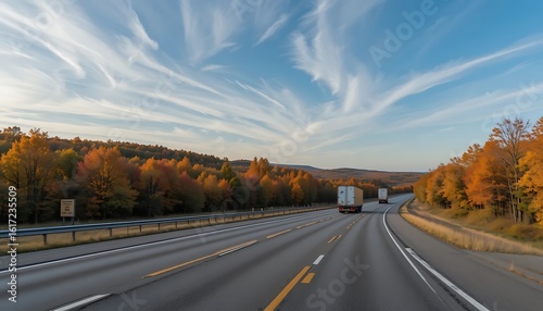Obraz premium Autumnal Highway Scene with Semi-Trucks Driving Through Vibrant Fall Foliage...
