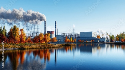 © jam, Naklejka premium Autumnal industrial complex reflected in tranquil lake