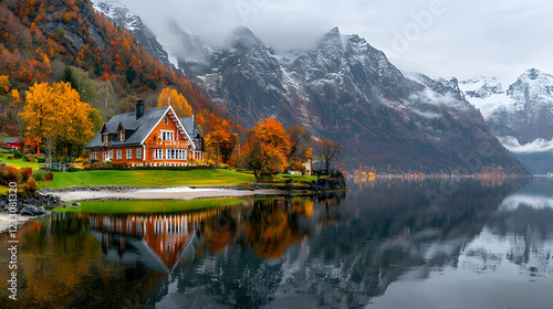 © BROPRADANA, Fototapeta premium Autumnal lake house, mountain reflection, Norway
