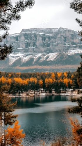 © PANGERANDESIGN, Naklejka premium Autumnal lake nestled in mountain valley.