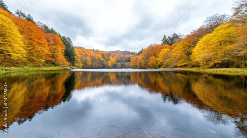 © PAPAHJAHATZ, Fototapeta premium Autumnal lake reflecting colorful forest. Tranquil, serene scenery