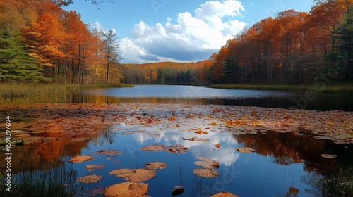 © afif, Obraz premium Autumnal lake reflecting fall foliage