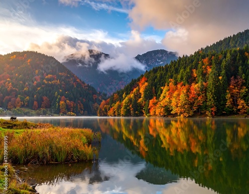 © shopia, Fototapeta premium Autumnal Lake Reflections in Mountainous Landscape