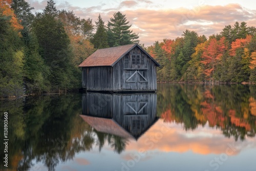 © jambulart, Fototapeta premium Autumnal lake reflects wooden structure, colorful trees.