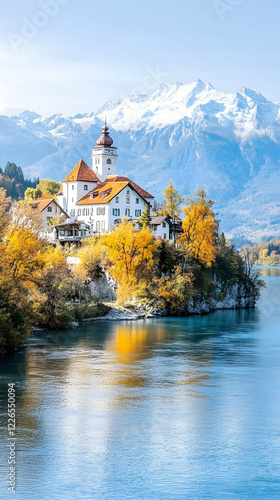 © Lailatul, Fototapeta premium Autumnal Lakeside Castle, Alpine Mountains Background, Calm Water Reflection, Tourism Postcard