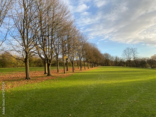 © BC-Consulting, Naklejka premium Autumnal landscape, naked trees in the park at the end of the day, Autumn long three shade, suggestive UK landscape