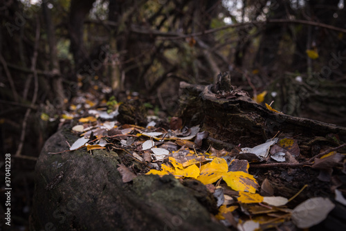 © JMDuran Photography, Obraz premium Autumnal leaves resting on the trunk of a dead tree