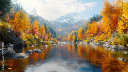 © tugkiara, Obraz premium Autumnal mountain river valley reflection; nature background