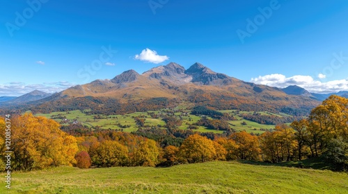 © PT CINTA SEJATI, Naklejka premium Autumnal mountain valley landscape, colorful foliage, clear sky