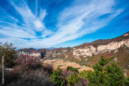 © 栗树林, Fototapeta premium Autumnal Mountain Valley Landscape with Clear Sky