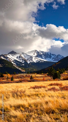 Fototapeta premium Autumnal mountain vista with snow-capped peaks (1)