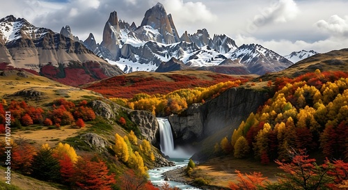 © Erisa, Fototapeta premium Autumnal Mountain Waterfall Landscape.