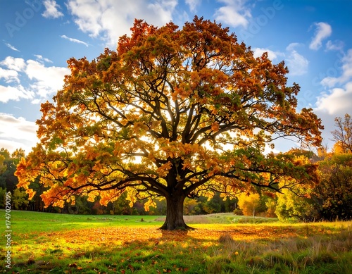 © Muhamad, Naklejka premium Autumnal oak tree in a sunlit meadow
