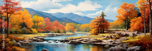 Naklejka premium autumnal panoramic landscape, featuring a tranquil river winding through a...