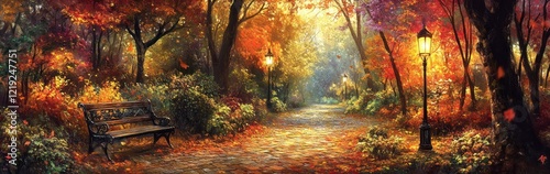 Naklejka premium Autumnal Park Path Bench and Lamps
