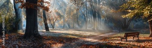 Fototapeta premium Autumnal Park Path with Sunlight Through Mist