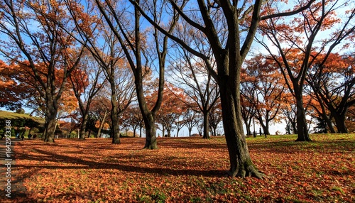 Naklejka premium Autumnal Park Scene Trees with Orange Leaves and Fallen Foliage.