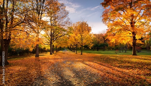 Naklejka premium Autumnal Parkland Vibrant Foliage Golden Leaves Serene Landscape