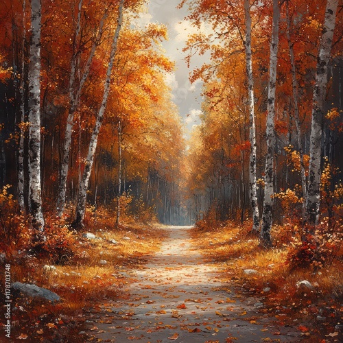 © Factory Stock, Obraz premium Autumnal Path: A Serene Walk Through Golden Birch Forest