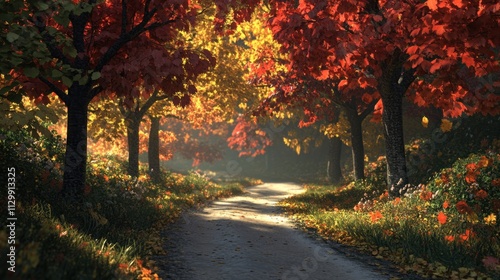 © cleo pick Art, Naklejka premium Autumnal Path: A Serene Walk Through Vibrant Fall Foliage and Golden Sunlight