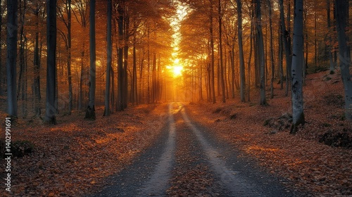 © luck, Obraz premium Autumnal Path: A Sun-Drenched Forest Road