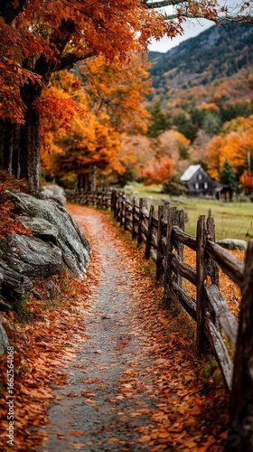 Naklejka premium Autumnal path, leaves strewn, rustic fence, distant cabin, mountains