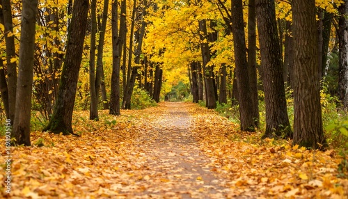 © Eni, Fototapeta premium Autumnal path lined with golden trees (1)
